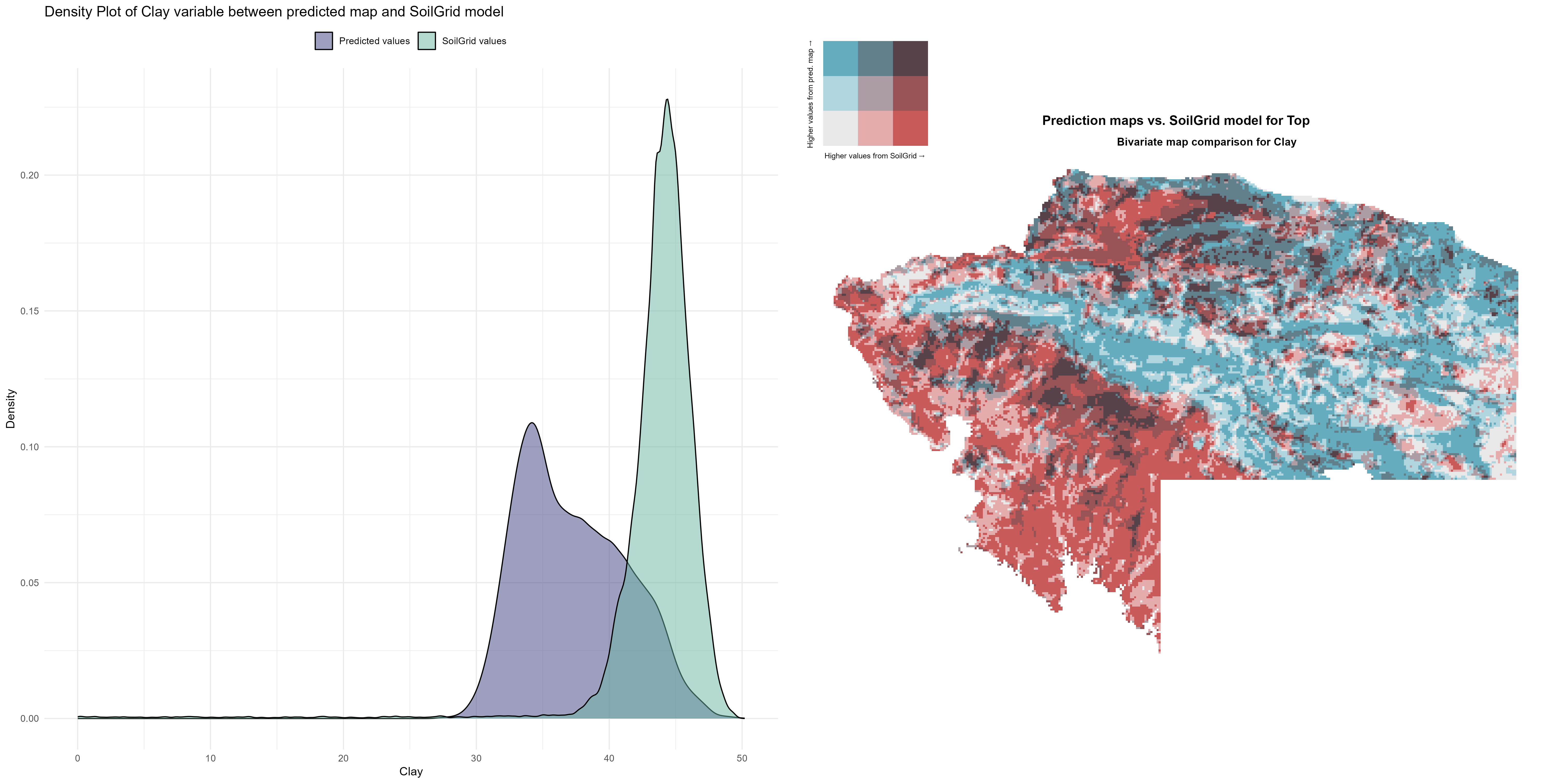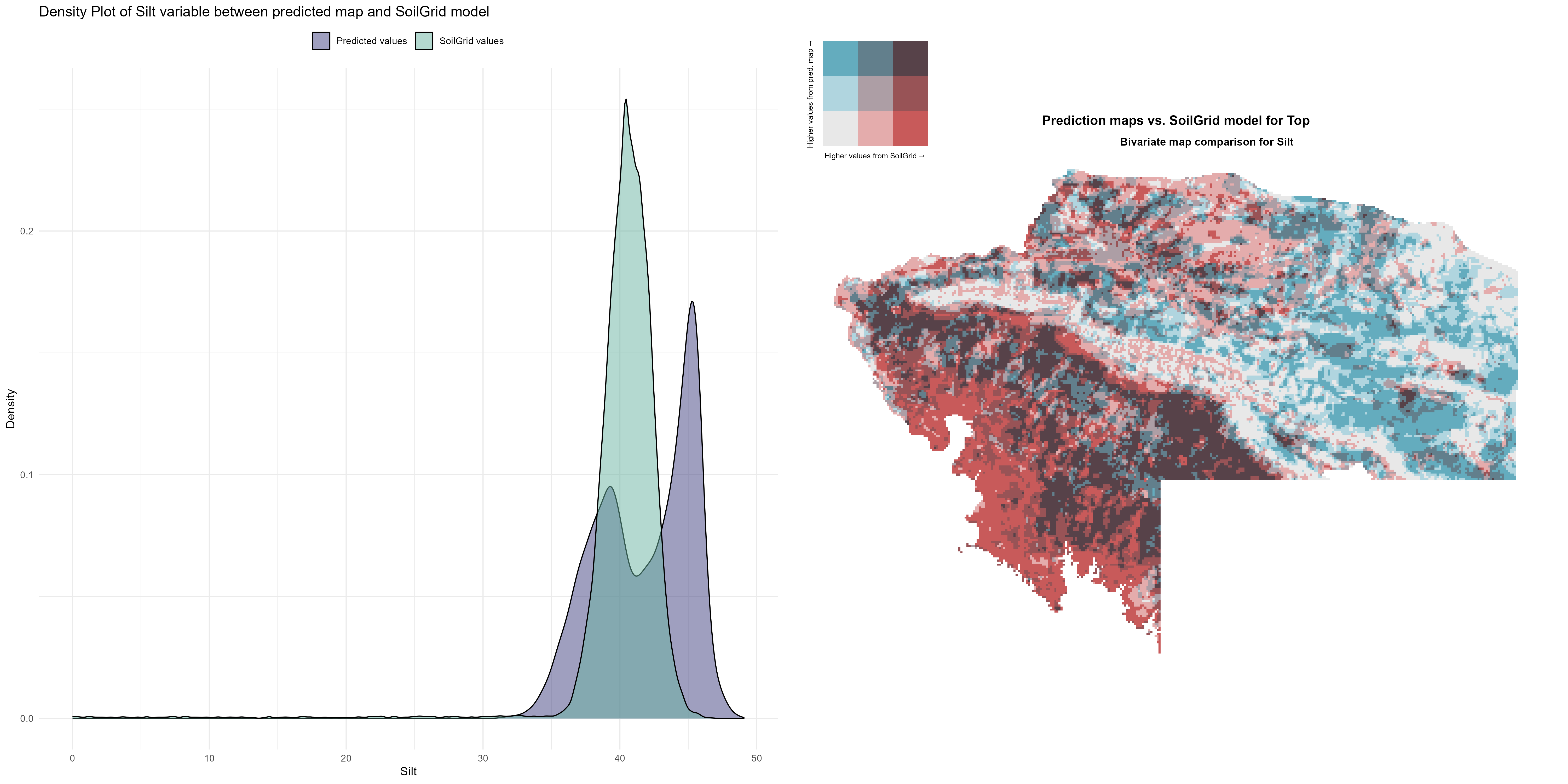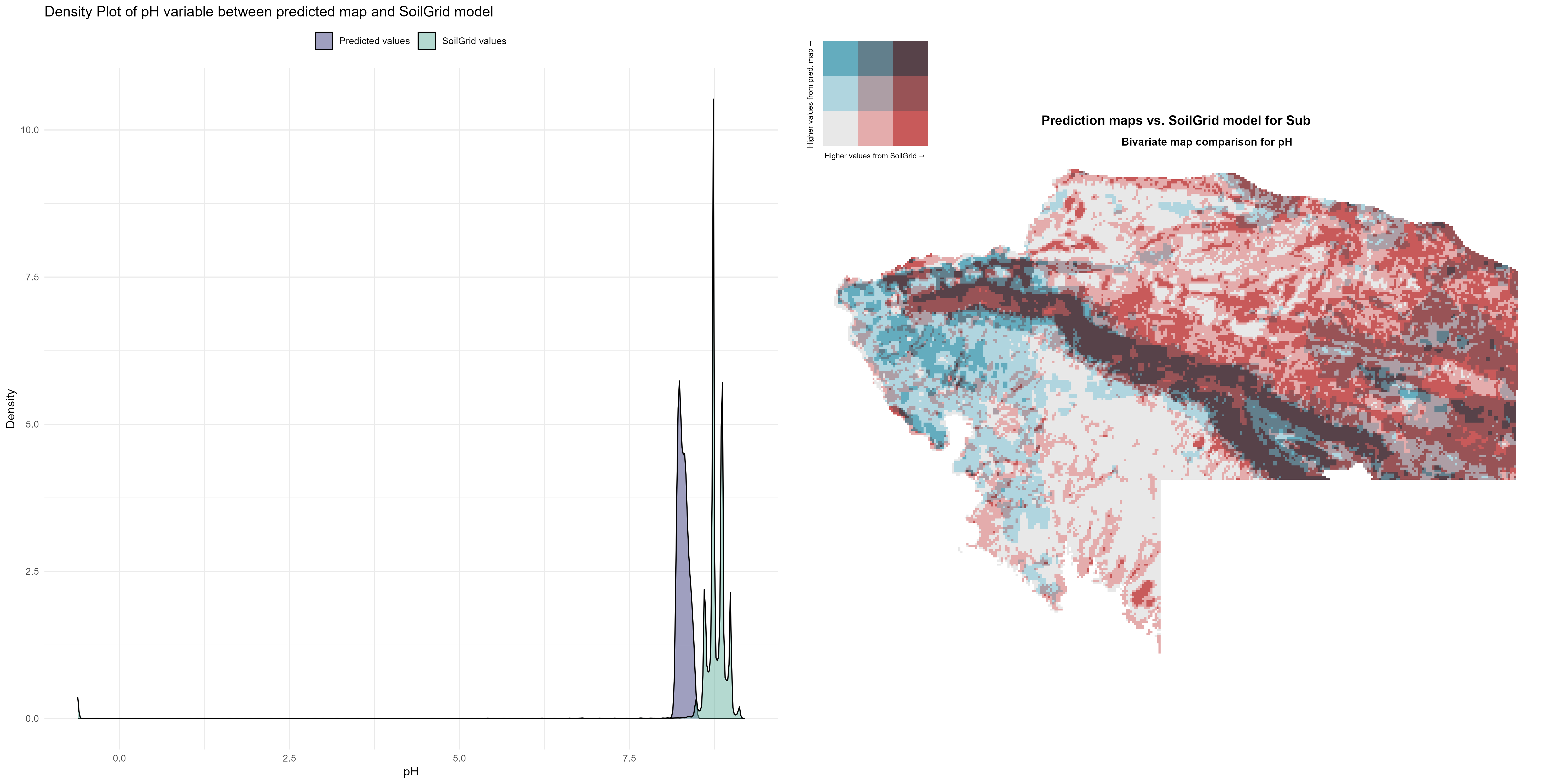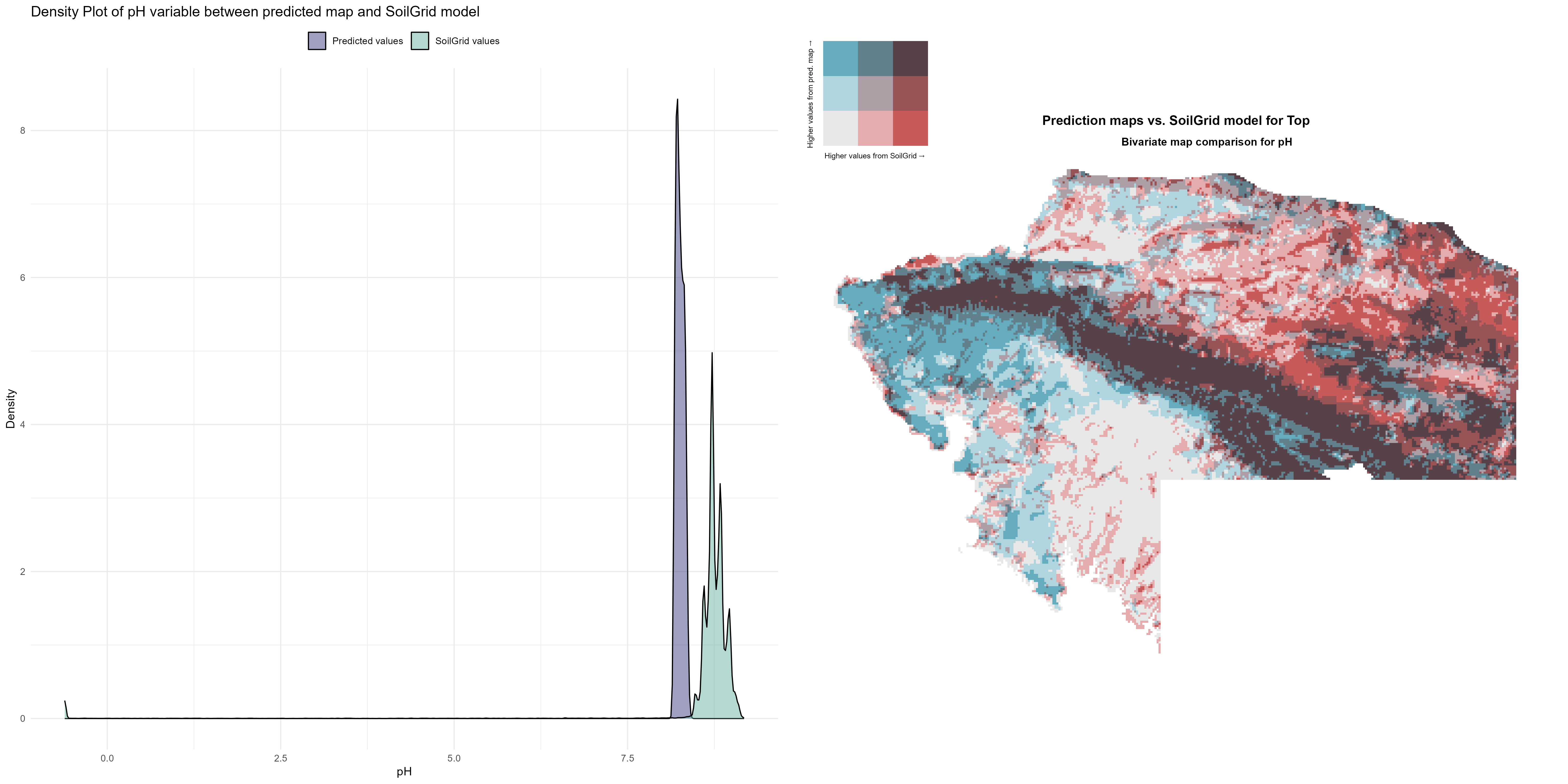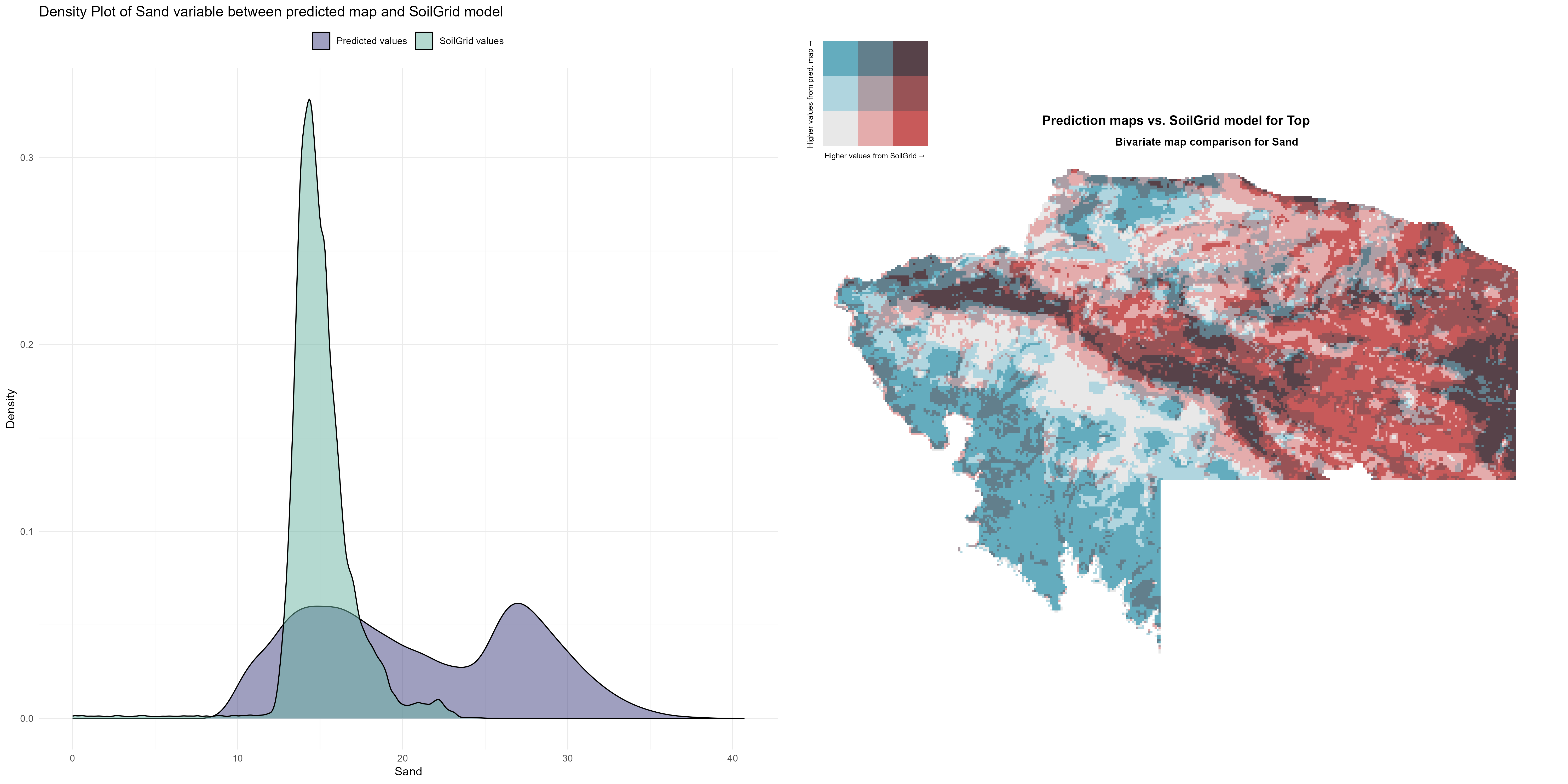 top = textGrob("Bivariate maps of predicted vs. SoilGrid values", gp = gpar(fontsize = 10, fontface = "bold")))