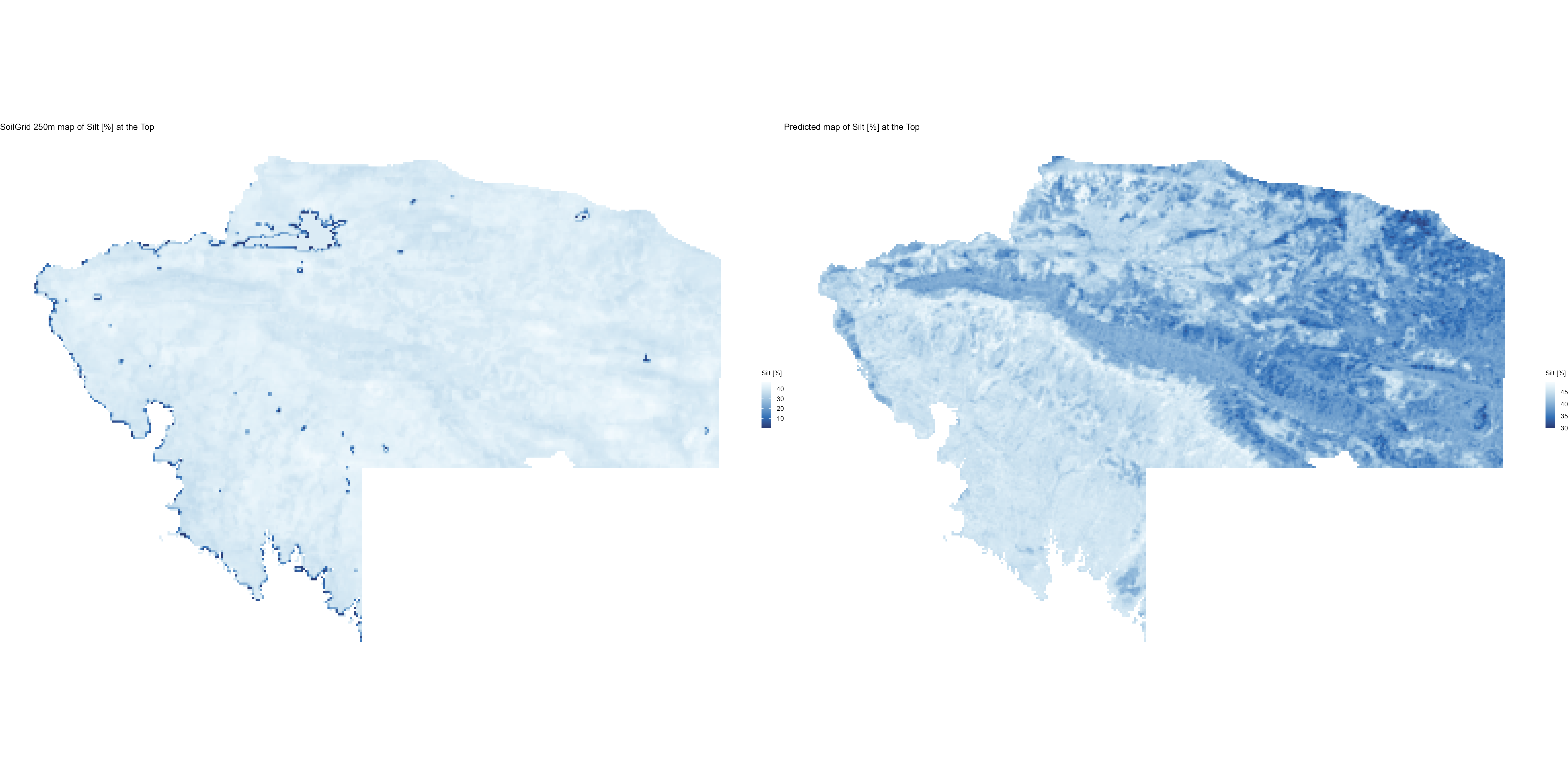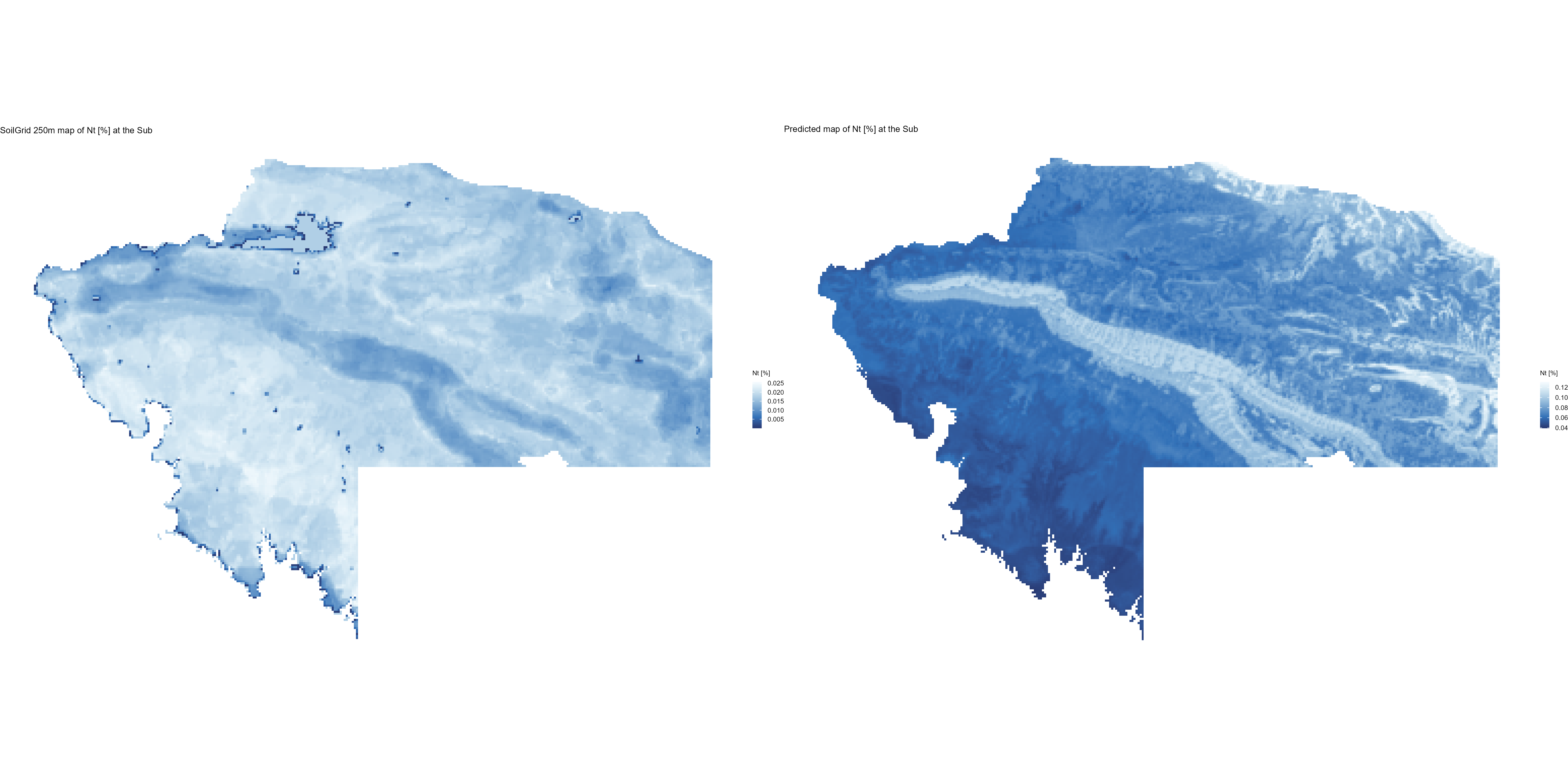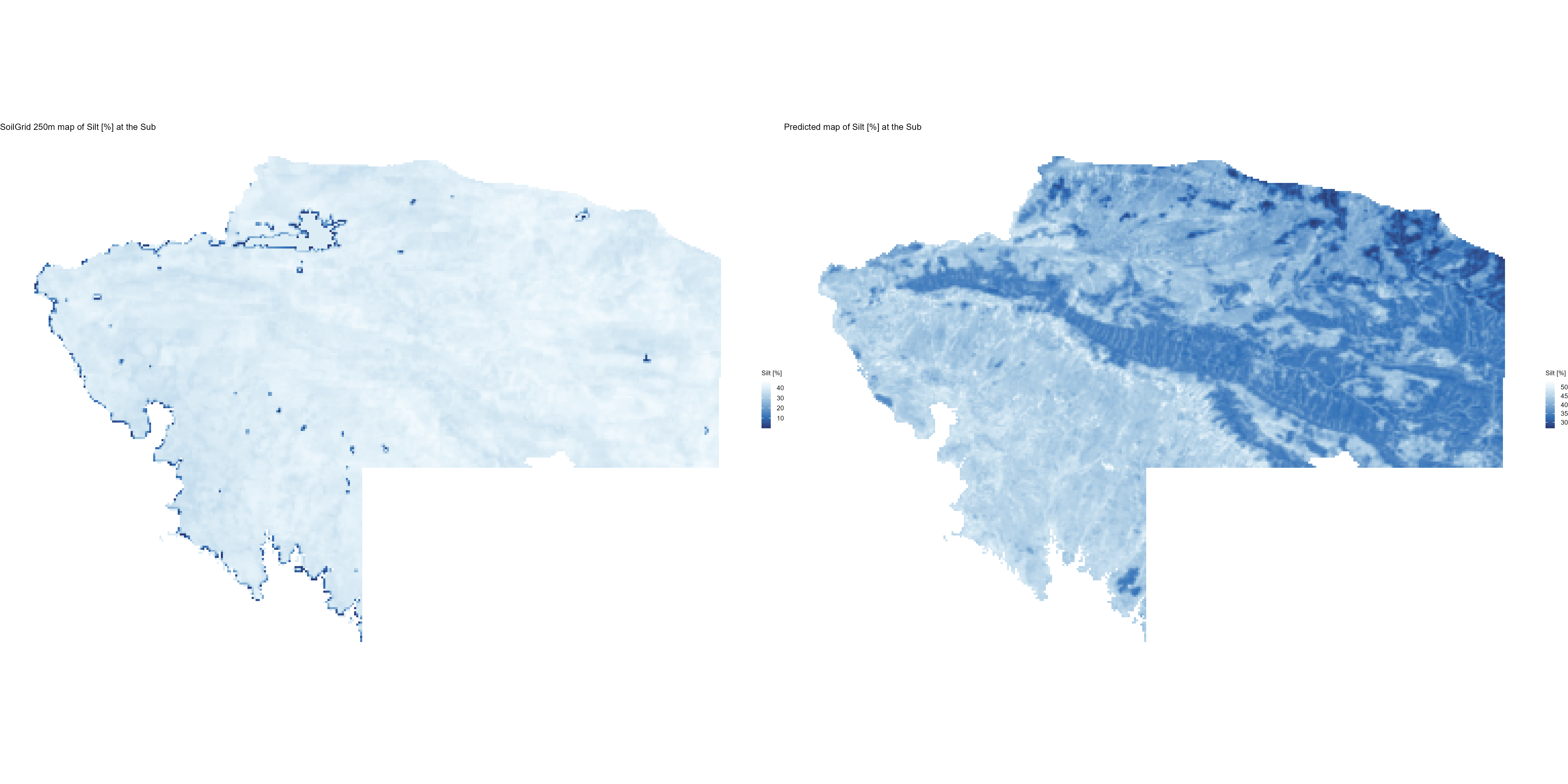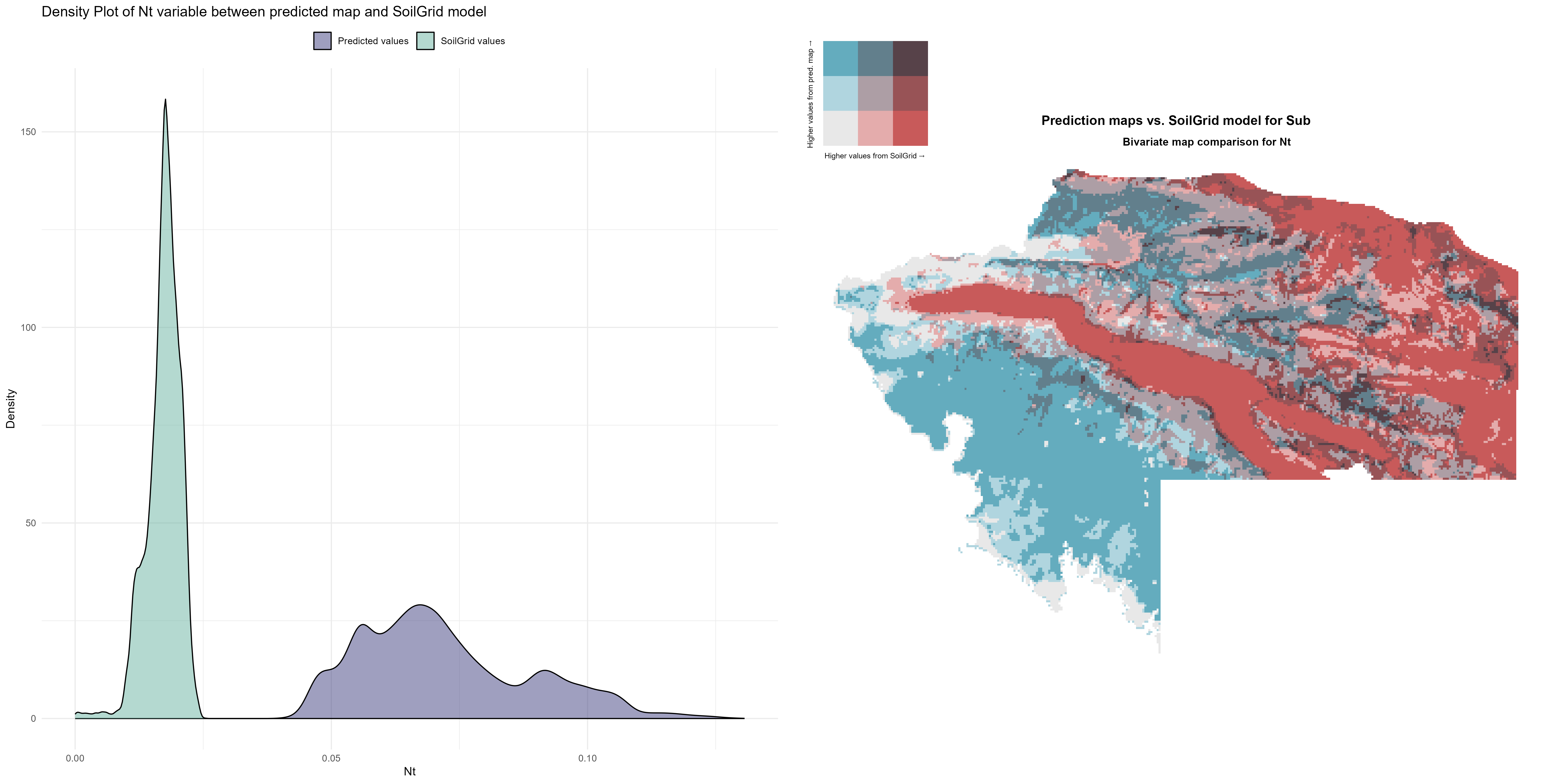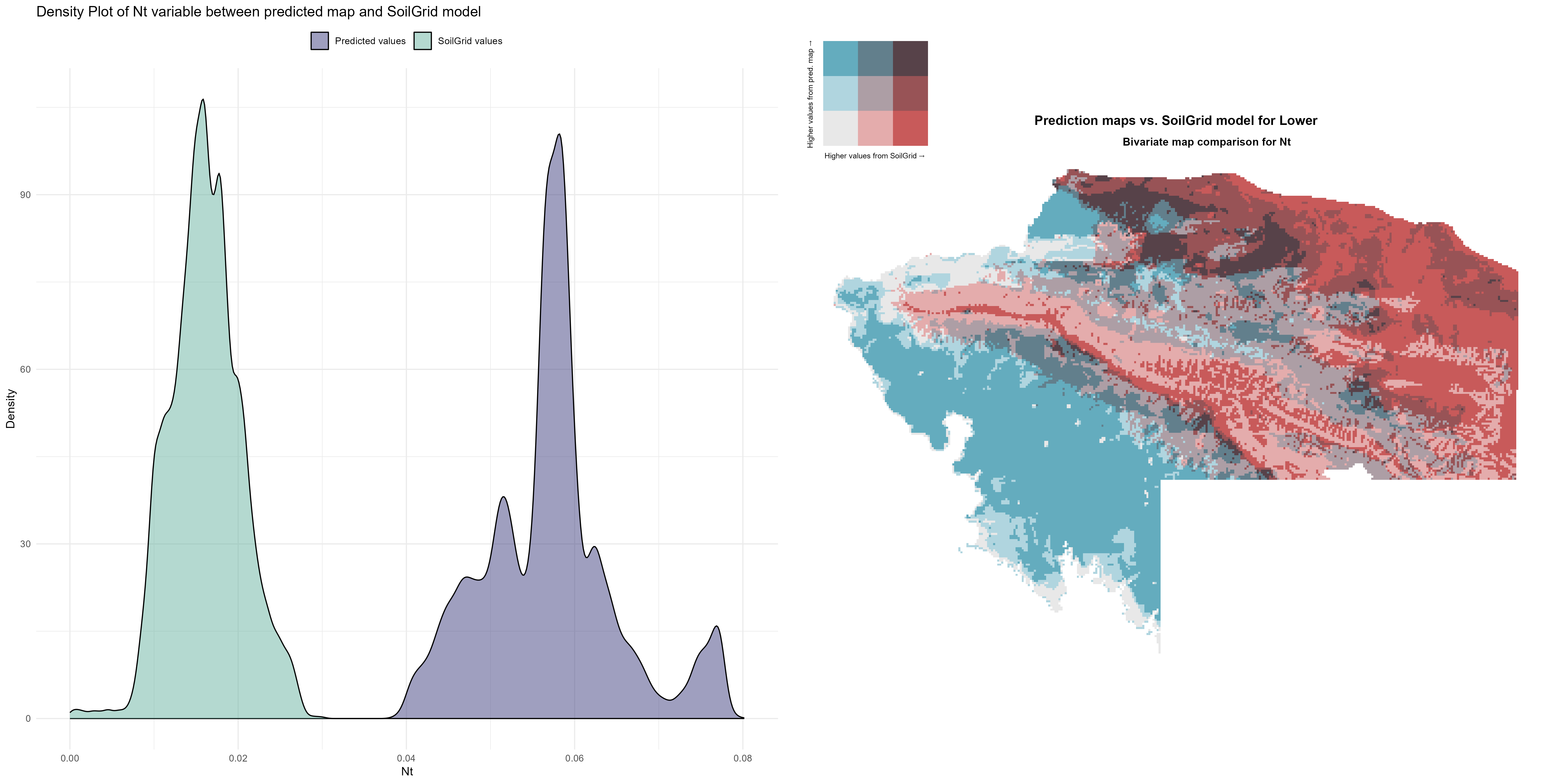 top = textGrob("Bivariate maps of predicted vs. SoilGrid values", gp = gpar(fontsize = 10, fontface = "bold")))